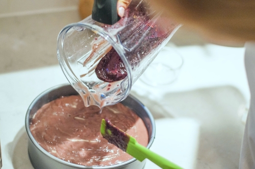 Blend the ingredients for each of the remaining layers until smooth, and pour into your pie pan in this order: 1) Creamy Cashew Banana Layer, 2) Sweet Blackberry Banana Layer, and 3) Blackberry Date Glaze Layer. Place your "cheesecake" in the freezer for 4-6 hours. Take it out and let it thaw for maybe a half hour before slicing and enjoying!